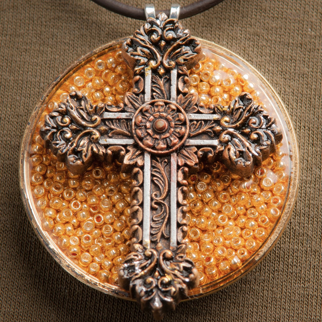 An ornate wooden cross sits on top of the back of an antique pocket watch case. Gold colored beads made of glass, fill this watch case piece. A coat of resin covers it, giving the background a 3D effect. This hangs from a brown, leather chord.