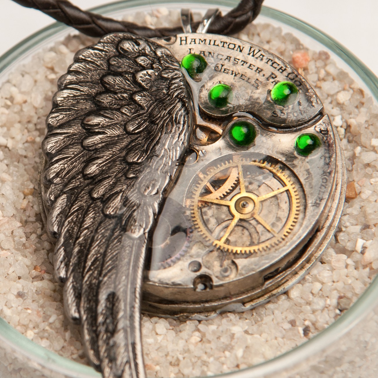 A large, heavy pocket watch movement was built by the Hamilton Watch Company in Pennsylvania. This was a model called the “974 Special” and was built for those working on the railroads in the 1920’s. It was coated in resin and there are 5 green Swarovski crystals that have been placed on top. A large metal wing has been attached to the side. This pendant hangs from a thick, braided leather chord.