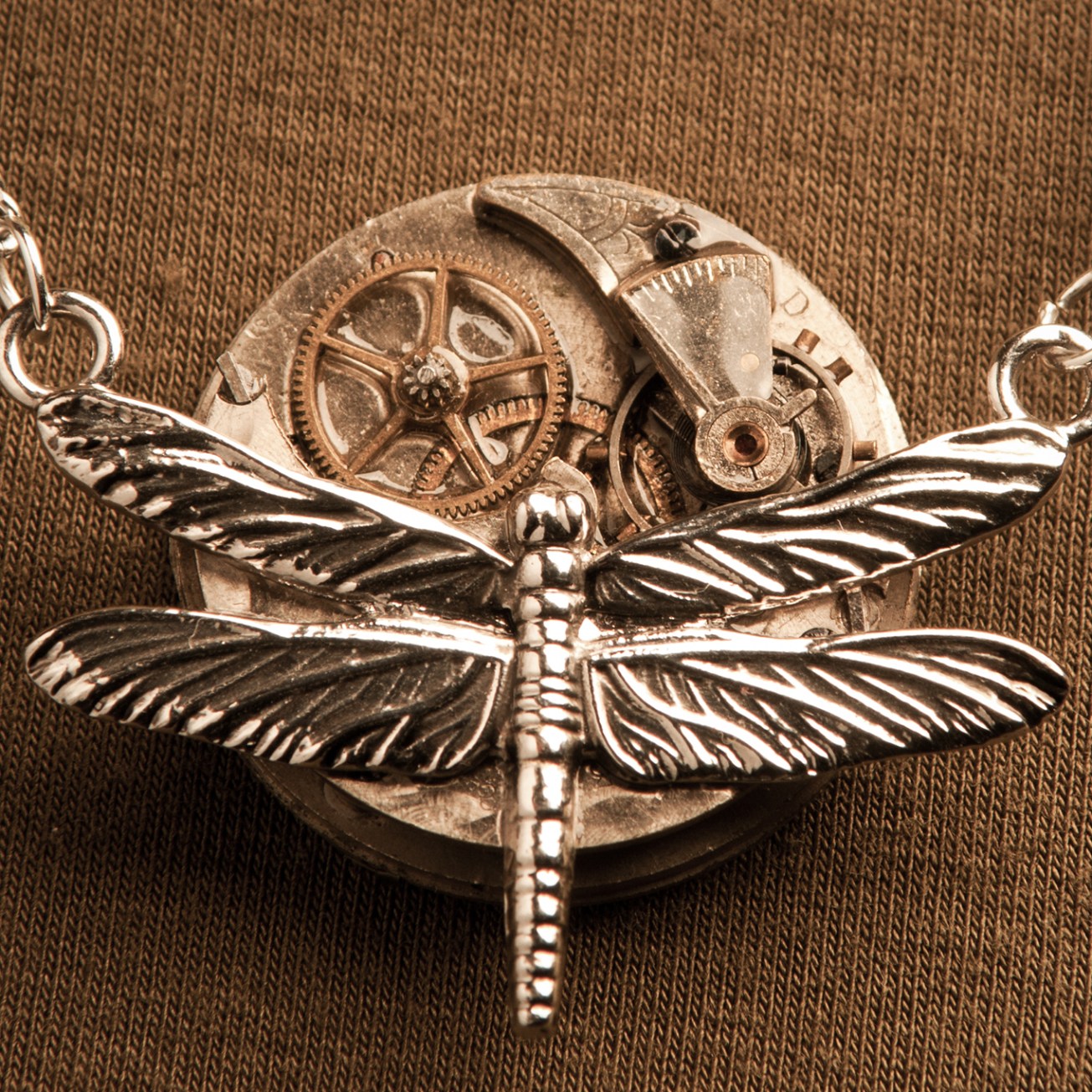 A watch movement made from the Columbia Watch Company in the 1930’s has a simple coat of resin on it. A metal dragonfly is spread on the front of this. This pendant hangs from a stainless steel chain.