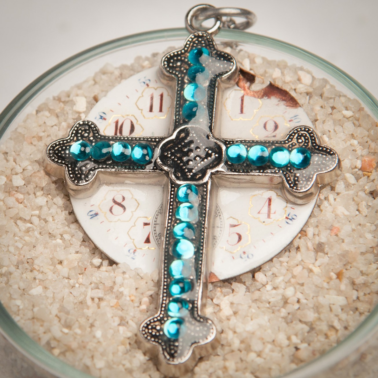 This hand painted, enamel coated, copper pocket watch dial, has a coat of resin. The dial matches those that were made in the 1920’s. On top of this dial is a bronze cross. Inside of the cross are lines of blue Swarovski crystals. This pendant hangs from a leather chord.