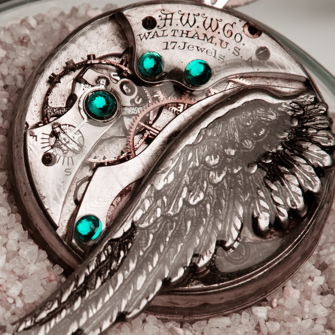 This watch movement is signed at the top by the American Watham Watch Company which operated out of Waltham, Massachusetts. This mechanism has a serial number matching it to the production year of 1884. It has a thin coat of resin on it along with 4 blue Swarovski crystals. There is a metal wing on the side, also coated in resin. This hangs from a tan leather chord.