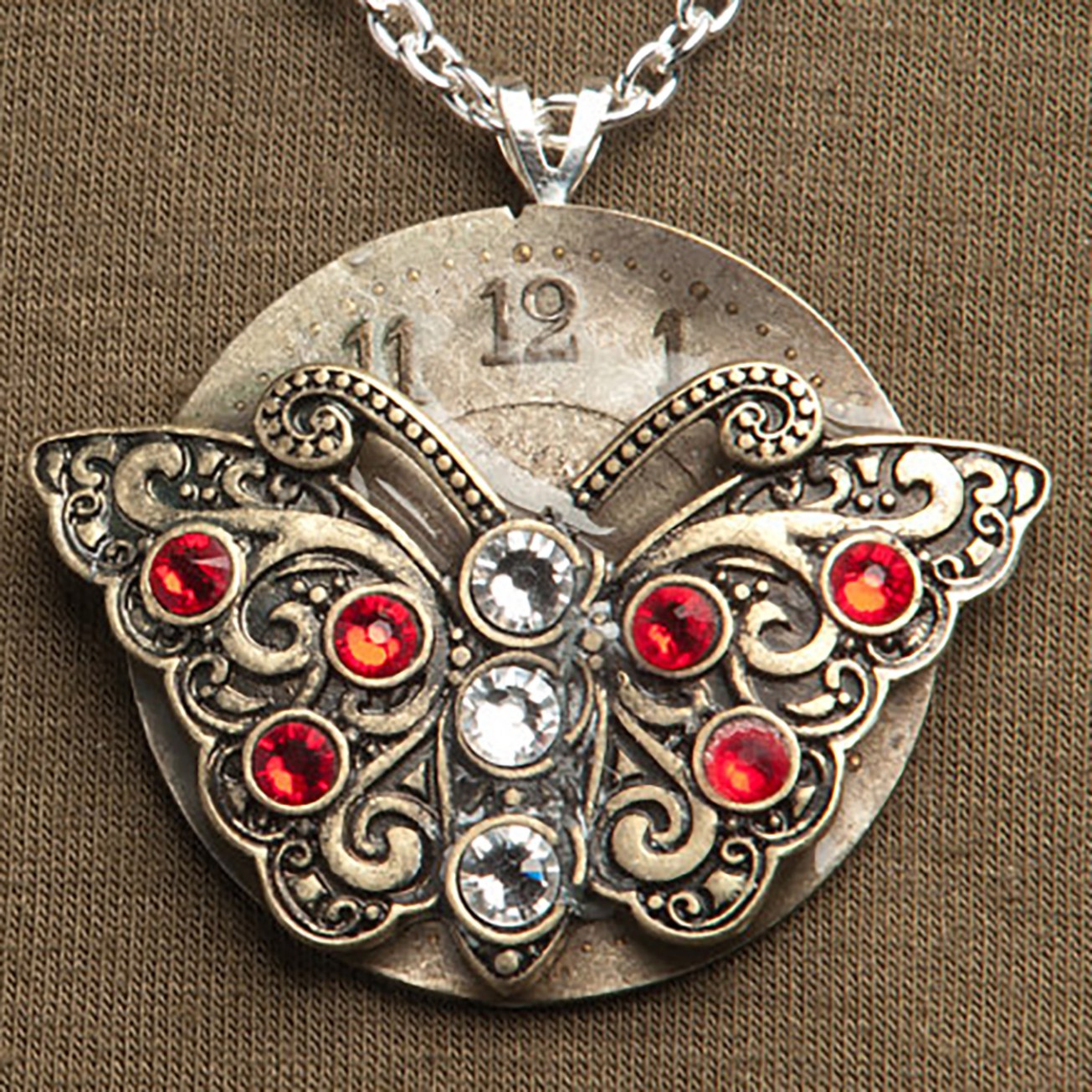 This is a metal, antique, pocket watch dial from the 1930’s. It has a thin coat of resin on top of it. Then there is a metal butterfly near the center. The butterfly is filled with clear and red colored Swarovski crystals. This hangs from a silver-filled chain and clasp.
