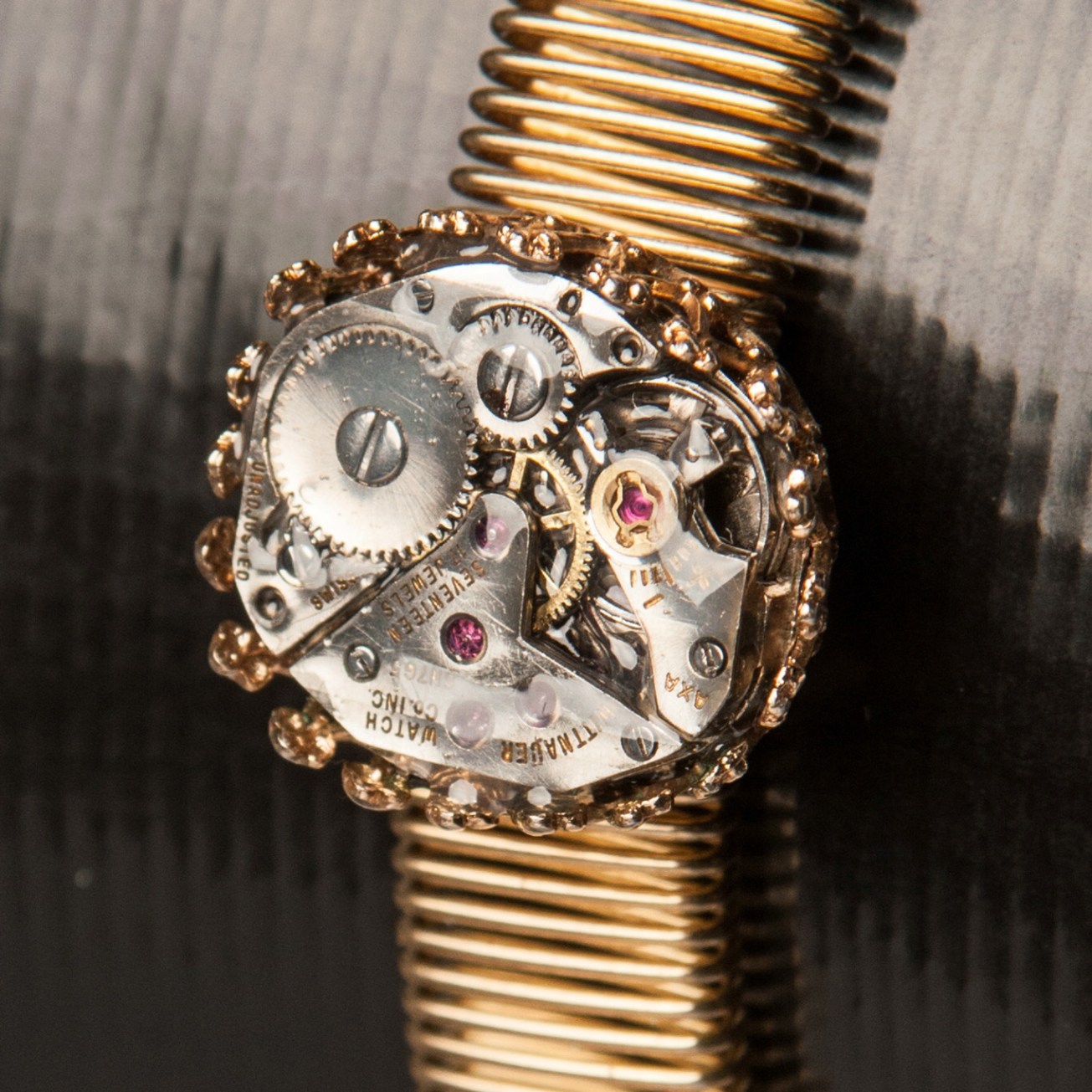 An antique bracelet was gold shielded. This process is similar to gold plating where a think layer of gold is applier to the outside of a piece of jewelry. The metal adjustable, gold shielded bracelet, has a gold shielded bezel which has been attached to the top. Inside of that bezel, a watch movement from the 1920’s has been placed and coated in resin.