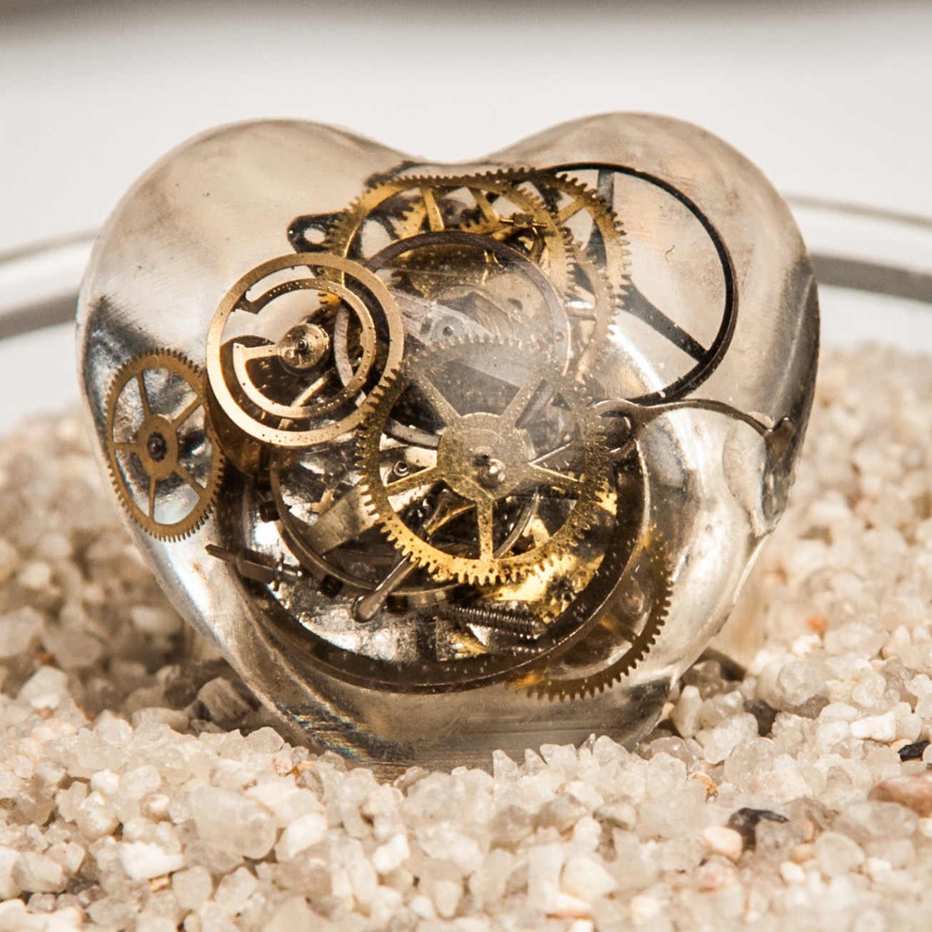This is a heart, made of resin, attached to a metal adjustable ring base. The ring is transparent and one can see a variety of cogs, wheels and gears inside of this.