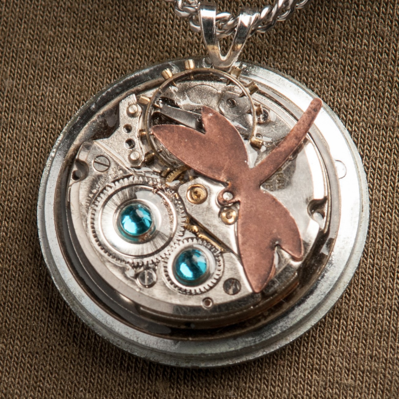 This is a 1920’s, antique watch movement, that has been placed within a stainless steel watch backing. Two blue Swarovski crystals have been attached to the top of the piece. A copper dragonfly was attached to the right side. A thin coat of resin covers everything. This hangs from a stainless steel chain.
