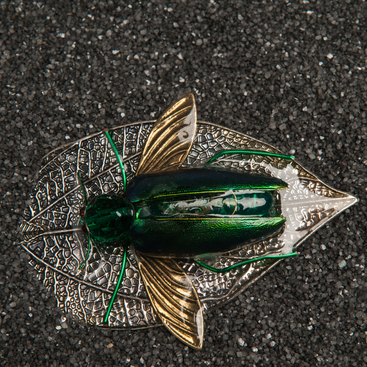 This brooch is made with a large, silver colored, metal leaf, coated in resin. On top of that leaf is a jeweled beetle made of various materials. The antennae and legs are made of very thin, green wire. The head is made of a green, glass bead. The eyes are orange Swarovski crystals. The body is made of a pear-shaped piece of resin, colored green and filled with antique gears and wheels. The shells are actual shells from a jeweled beetle. The wings are gold-colored, metal wings. The whole piece has a brooch backing.