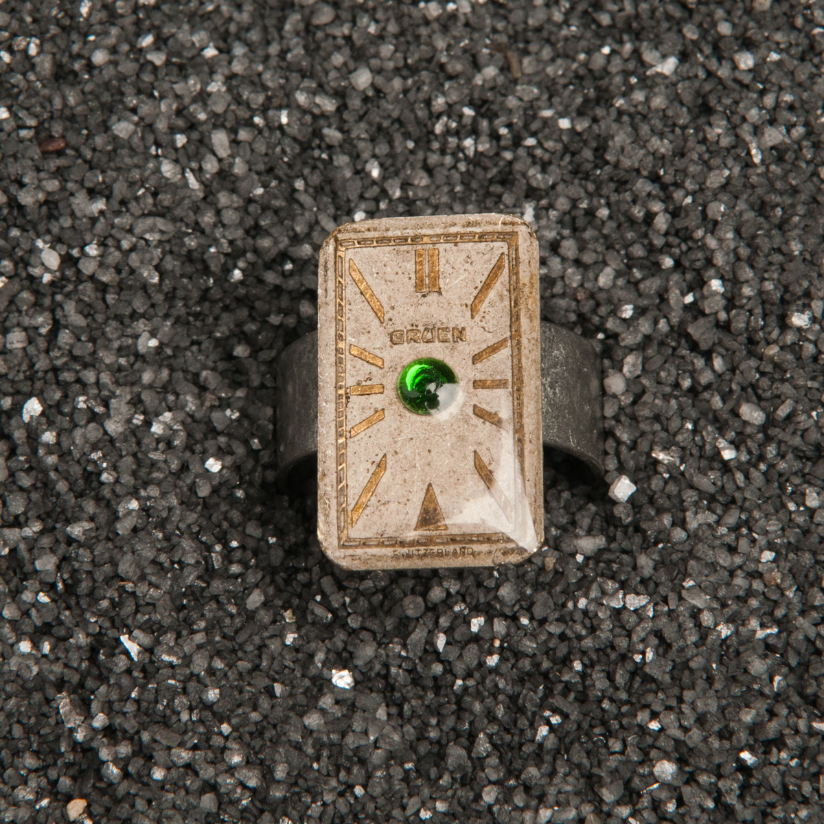 An antique watch dial from the Gruen Watch Company has a coat of resin on it and a single, green Swarovski crystal. It has been attached to an adjustable, metal ring base.