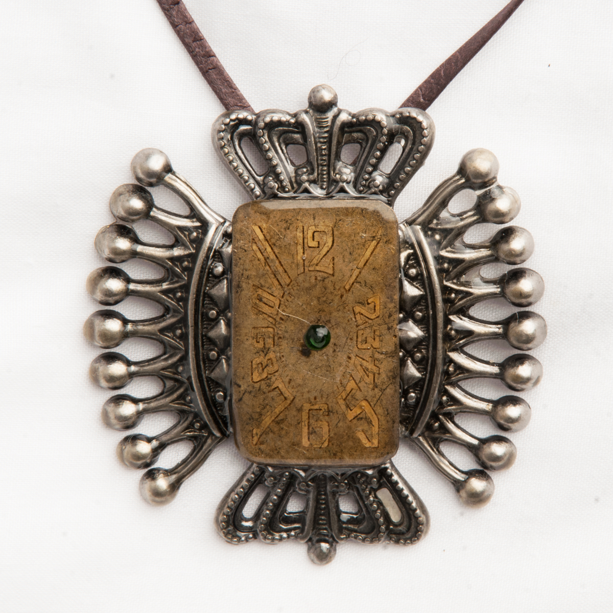 An antique, rectangle, watch dial, probably from the 1920’s, has a single green, Swarovski crystal in the center and a coat of resin over the rest. There are four metal crowns on the sides, under the dial. This is hung using a thin, brown leather strap.