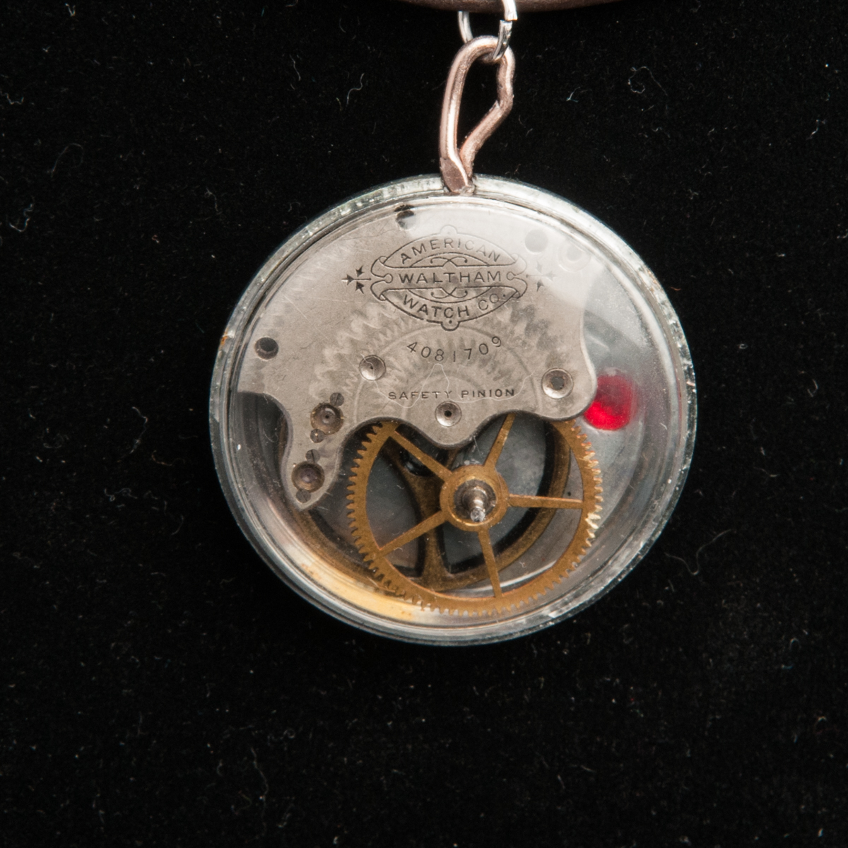 A pendant is made from an antique watch part, made by the American Waltham Watch Company, in 1888, sits at the top of this pendant. Below that piece, are two gears and to the right is a single, red Swarovski crystal. This pendant hangs from a brown leather chord.
