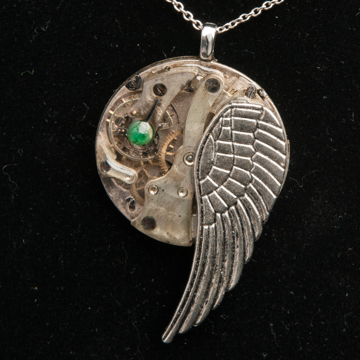 This pendant is made with an antique pocket watch movement with a metal wing on the side. A coat of resin covers everything. A single, round emerald is on the top of a gear movement. This hangs from a stainless steel chain.