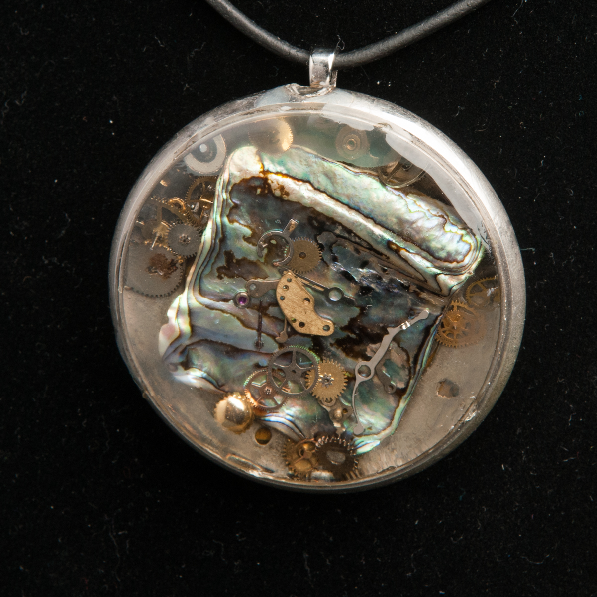 This pendant uses an antique pocket watch case and fills it with resin and items. There is a medium sized, Paua shell in the center along with a variety of tiny gears, wheels and cogs. This pendant still has the original watch dial on the back and hangs from a thick, black leather chord.