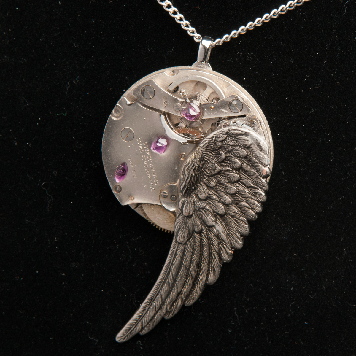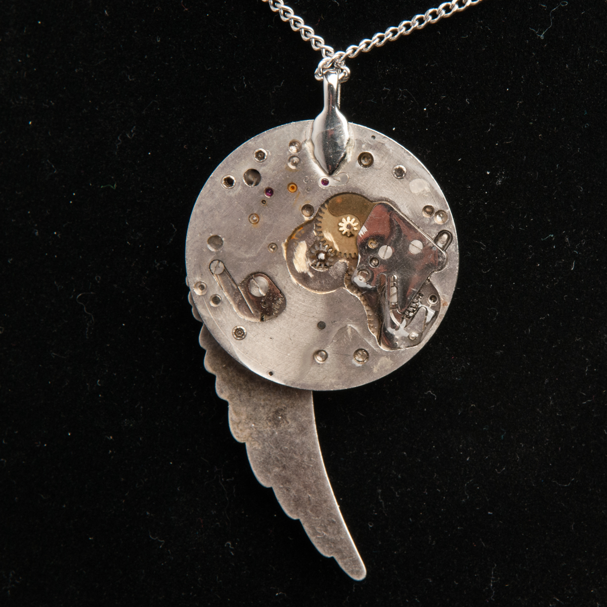 Next Previous Antique Pocket Watch with Rubies by antiquariancouture January 15, 2015 All Jewelry, Pendants antique, industrial, necklace, pendant, steam punk, steampunk, Victorian An antique pocket watch movement has 3 square-shaped rubies on top of it. A metal wing is attached to the side and a coat of resin covers it. The pendant hangs from a stainless steel chain. Share this: Click to share on X (Opens in new window) X More Click to share on Nextdoor (Opens in new window) Nextdoor Click to share on Facebook (Opens in new window) Facebook Click to share on Bluesky (Opens in new window) Bluesky Click to share on Threads (Opens in new window) Threads Like Loading... Related
