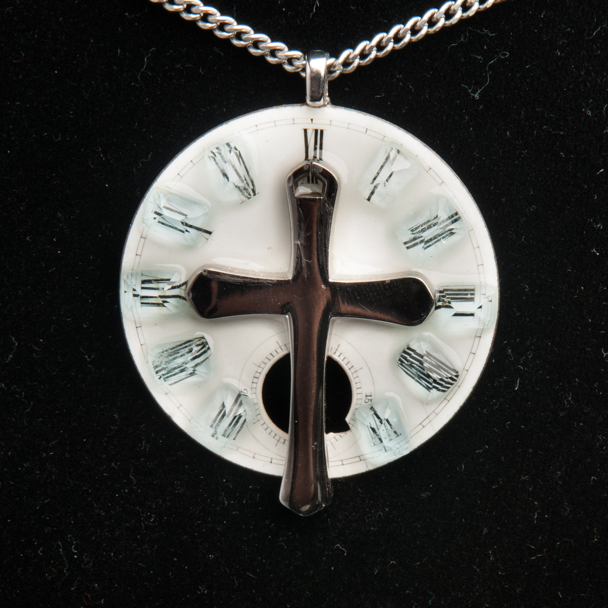 This necklace is made from an antique, pocket watch, dial. The dial is enamel, coated onto a copper plate. On top and in the center is a large stainless steel cross. On either side of the cross, there are 5, rectangle-cut, blue topazes, that are over the numbers. The ten topazes are surrounded by a coat of resin and this pendant hangs from a stainless steel chain.