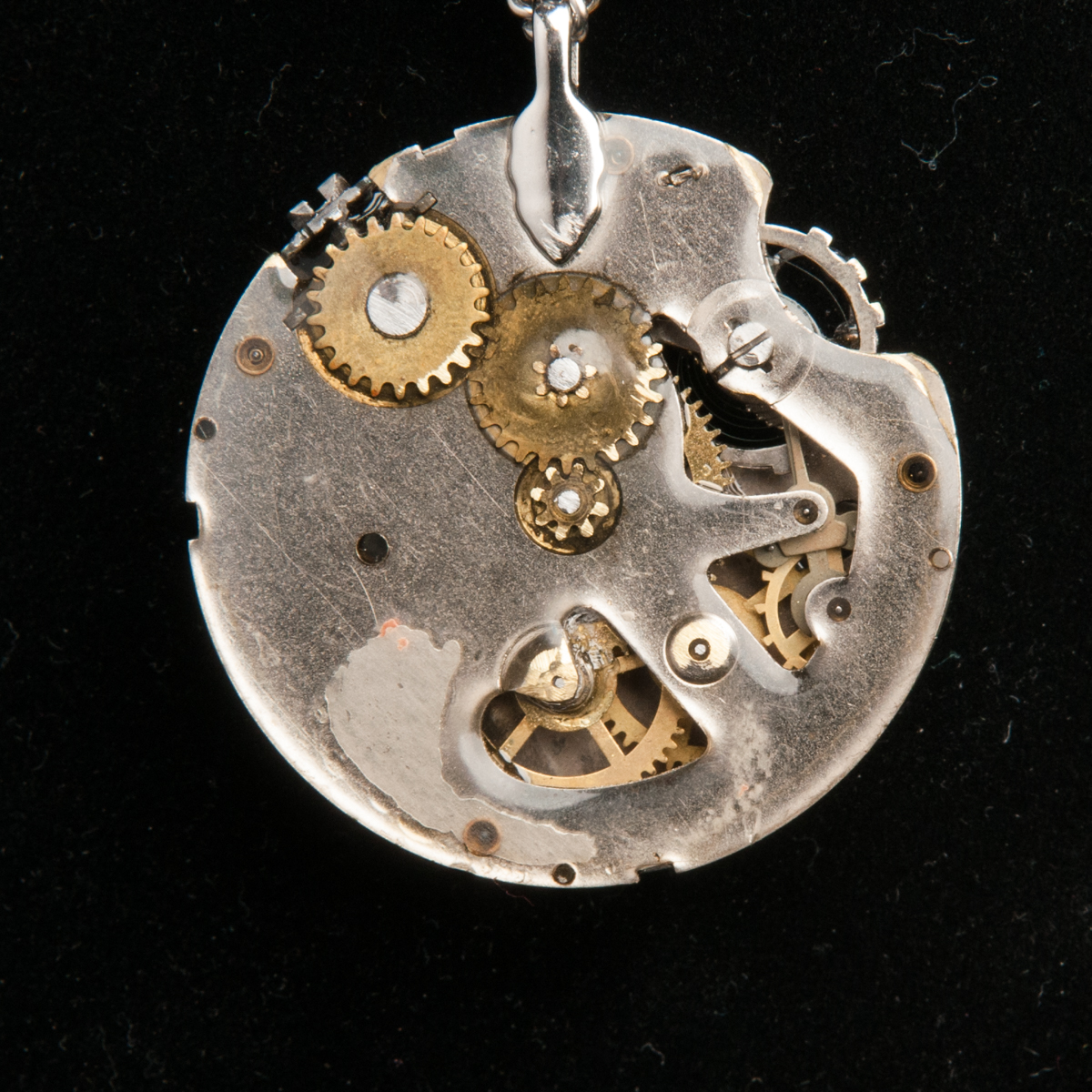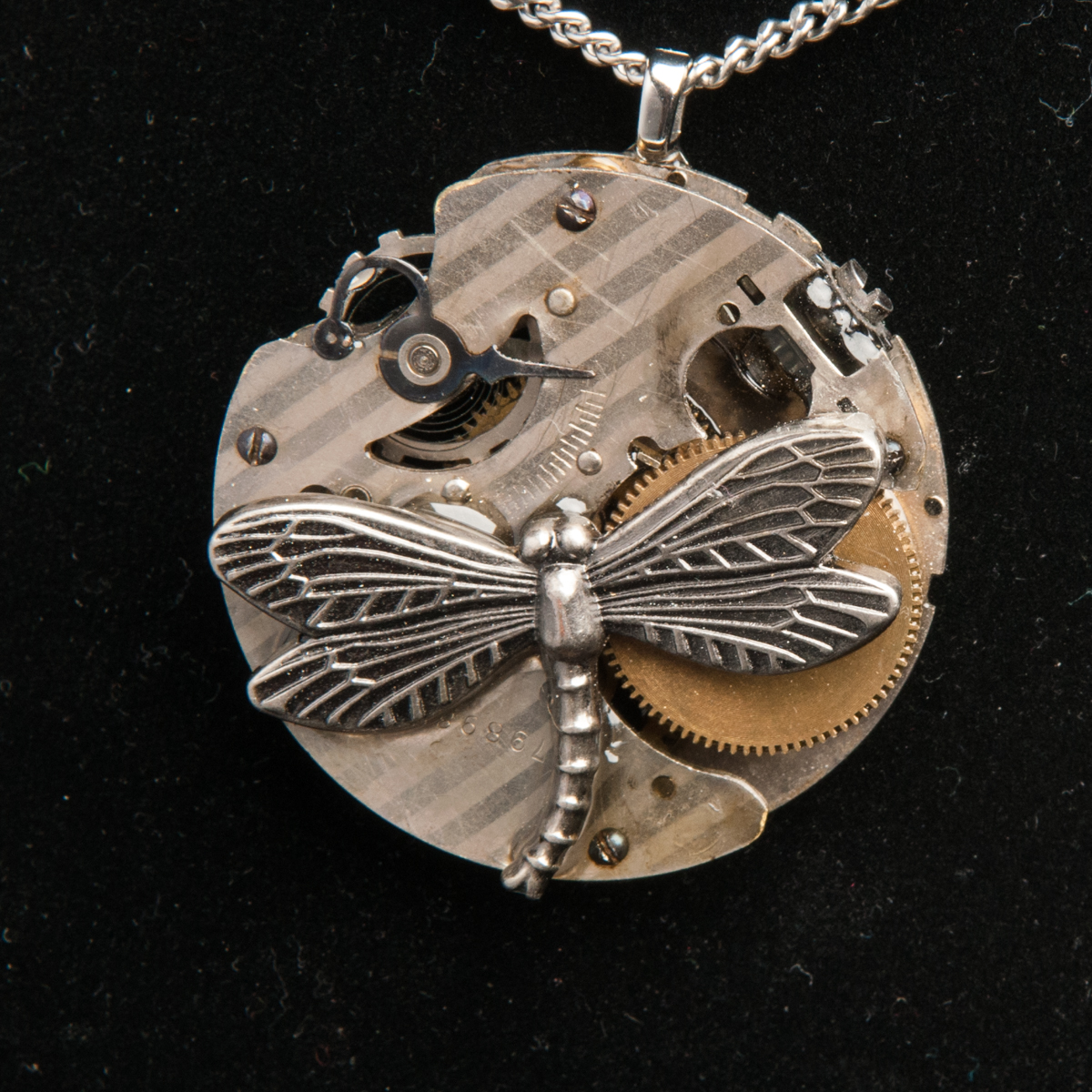 This necklace is made from an antique Dollar Watch movement. During the late 1890’s to about the 1950’s, companies started to make watches that were cheaper to produce and had less features. A dollar in 1892 is equivalent to about $27 today. In that time period though, when watches were seen as a luxury item, these watches were sold in cardboard boxes and made with almost no extra mechanics to keep the cost down. A larger than normal spring case was attached to the side and a metal dragonfly is attached to the top. This hangs from a stainless steel chain.