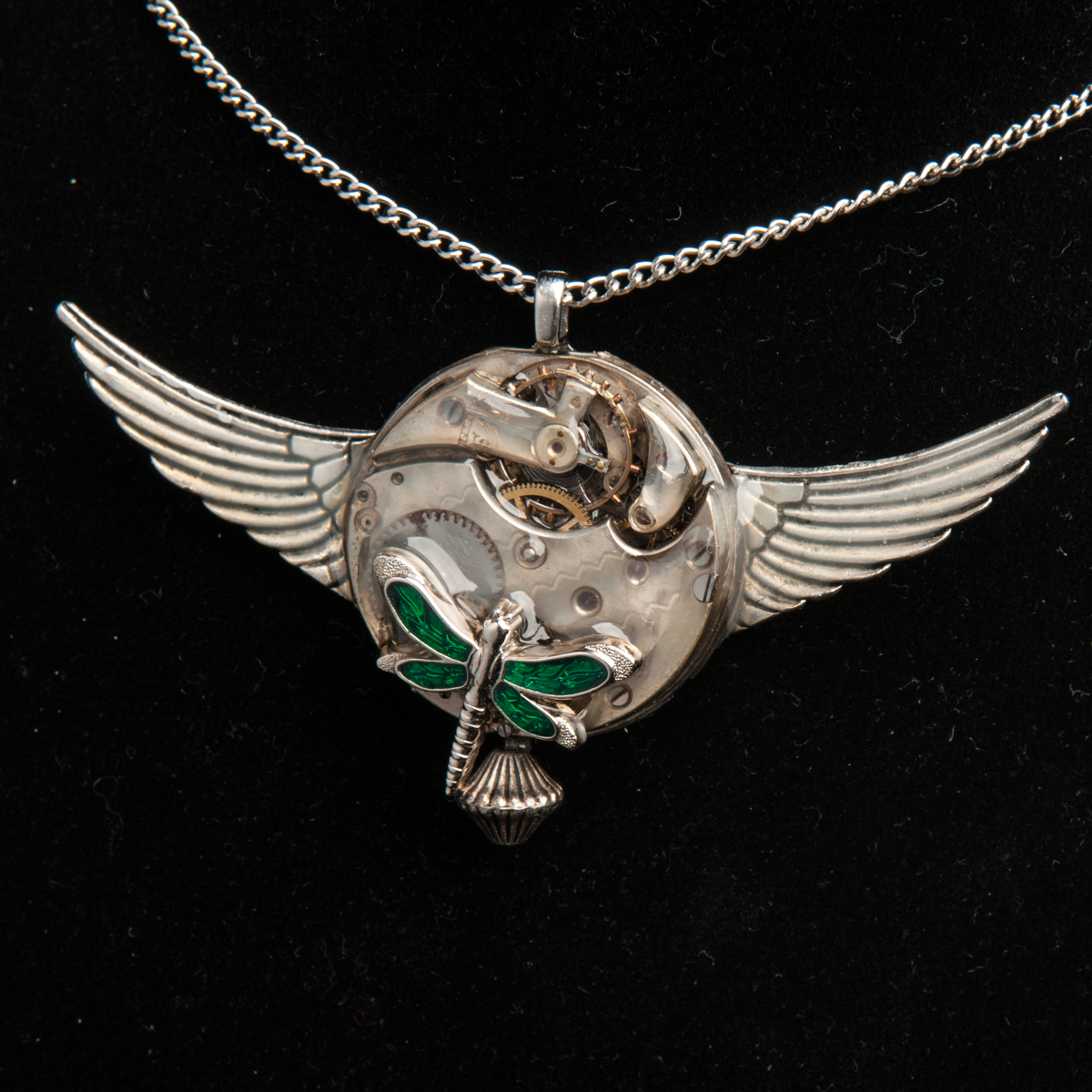 Here we have an antique watch movement, encased in resin and adorned with green dragonfly charm. The original winding crown for the watch, is still attached to the bottom of the movement. There are two metal wings, attached to the back on either side and this hangs from a stainless steel chain.