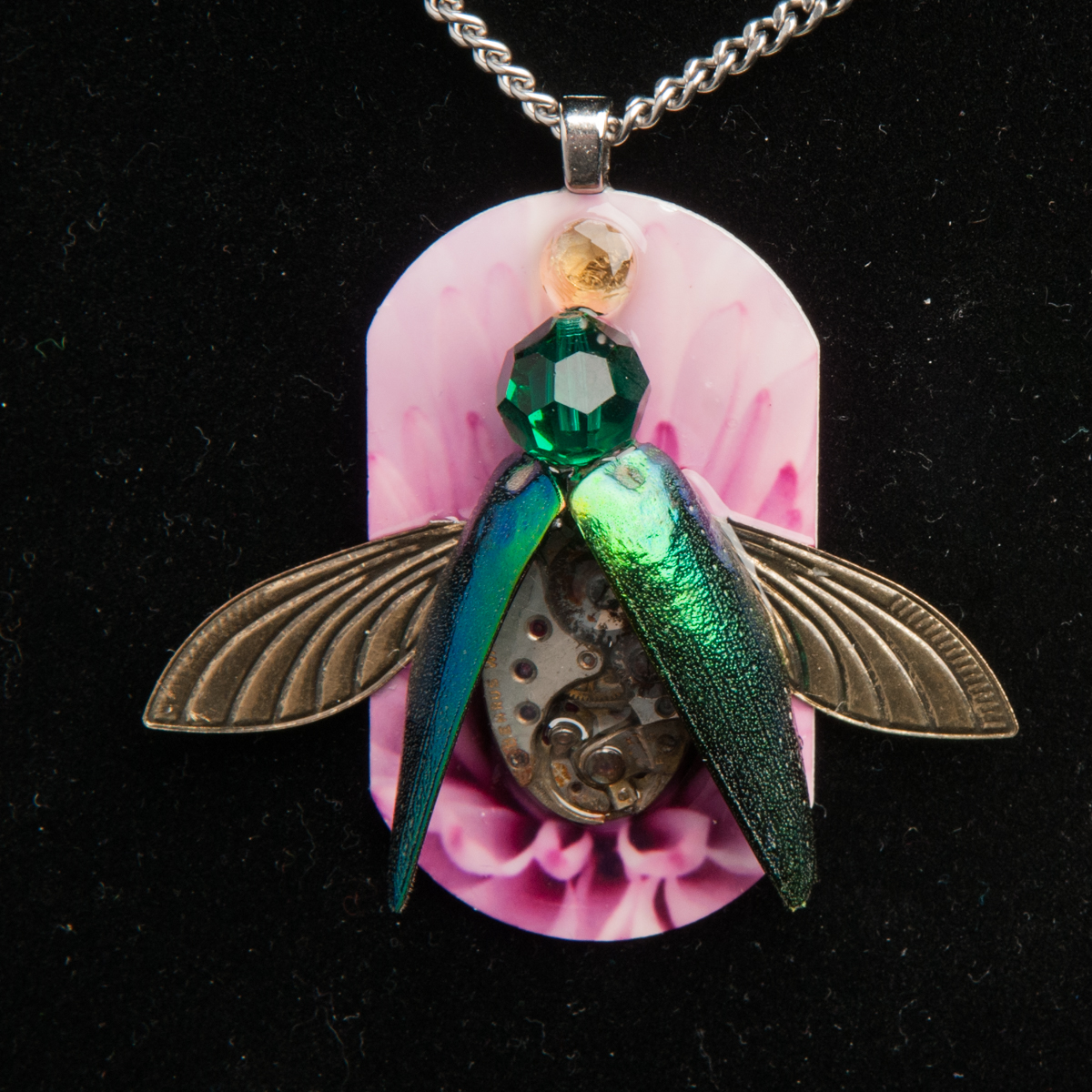 A necklace is made by making a jeweled beetle and attaching it to a dog tag. The dog tag has a flower image on it and on top of that is the beetle over a coat of resin. The body of the beetle is made using an oval-shaped antique watch movement from a ladies watch piece from the 1930’s. Two bronzed, metal wings are on either side and two green shells are actual jeweled beetle shells. A single green, glass bead is on top as the head. There is also a yellow topaz, at the top of the dog tag. The pendant hangs from a stainless steel chain.