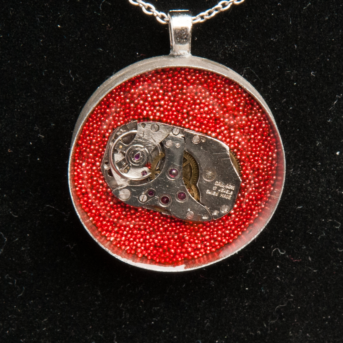 An antique watch movement is encased in resin, while over a layer of red, metal beads. The beads and watch are in an old jeweler’s tin. This hangs from a stainless steel chain.