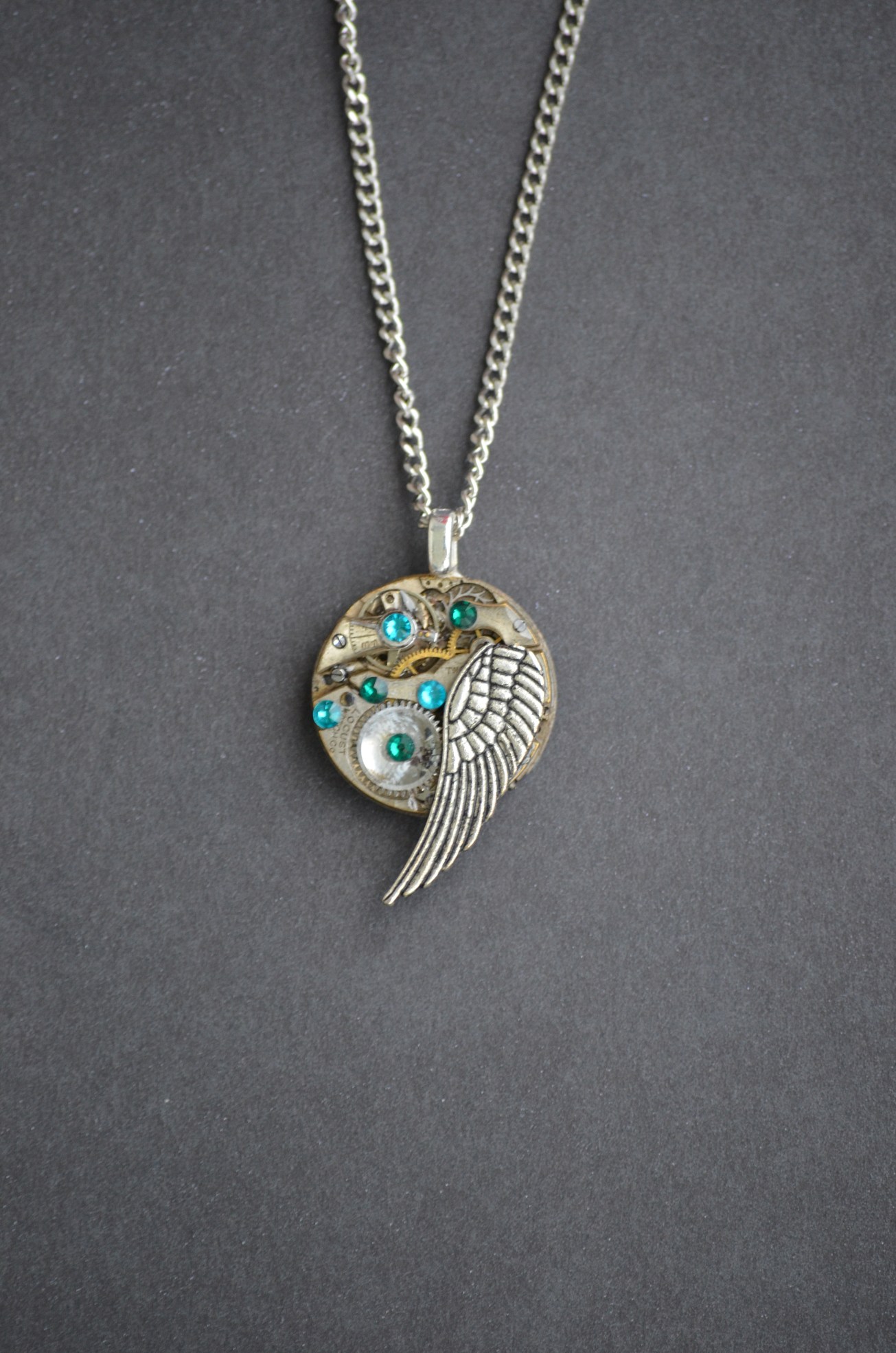 This is an antique watch movement made from the Locust Watch Company, around the 1920’s. It has a thin coat of resin over it and then has a metal wing to the side and six, blue/green Swarovski crystals on it. This hangs with a silver plated bail and a stainless steel chain.