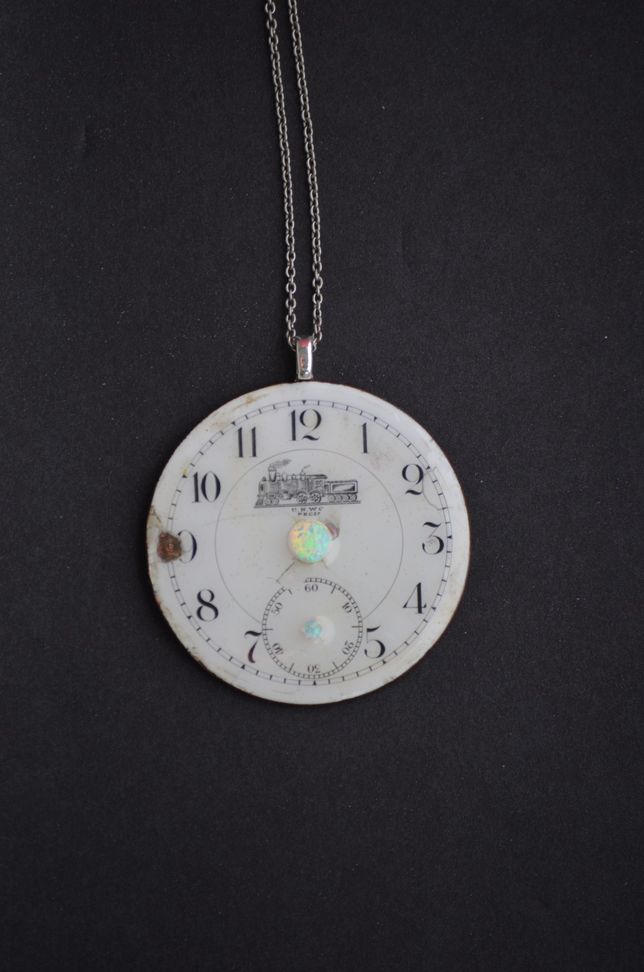 An antique watch dial, made by the U.S. Watch Company, in the 1850’s, is coated with resin. The dial is from a Trainmen’s Special, which was a series of pocket watches made for those who worked on the railroad, so they could use a standard time for their work and the train schedules. This dial has a large opal in the center and a smaller one near the bottom. This hangs with a silver-plated bail and a stainless steel chain.
