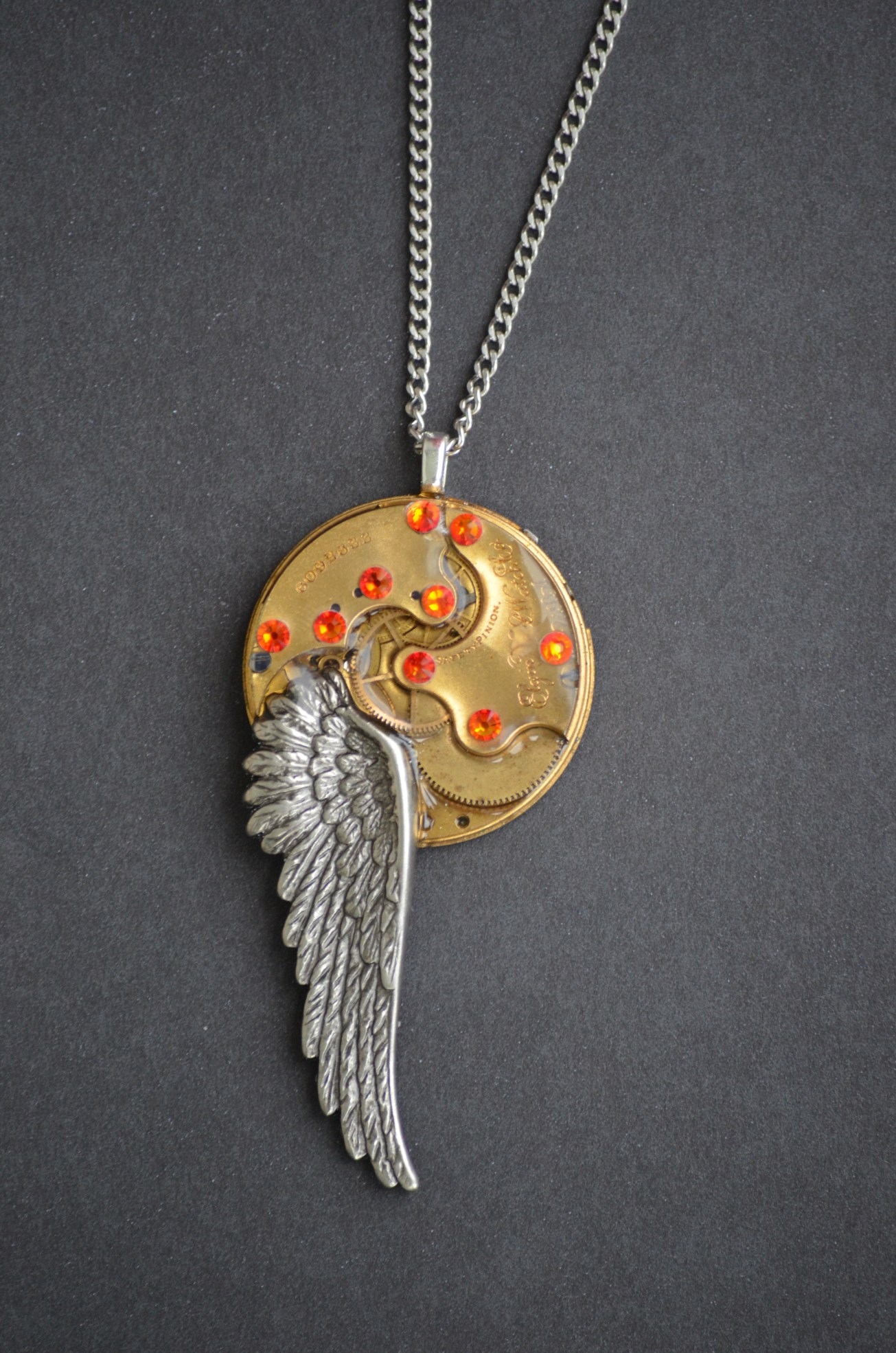 This antique watch movement was made by the Elgin National Watch company in 1896. It has a thin layer of resin over it. Then, nine, fire red/orange Swarovski crystals were attached above the screws on the plates. A metal wing is on the side. This hangs with a silver plated bail and a stainless steel chain.