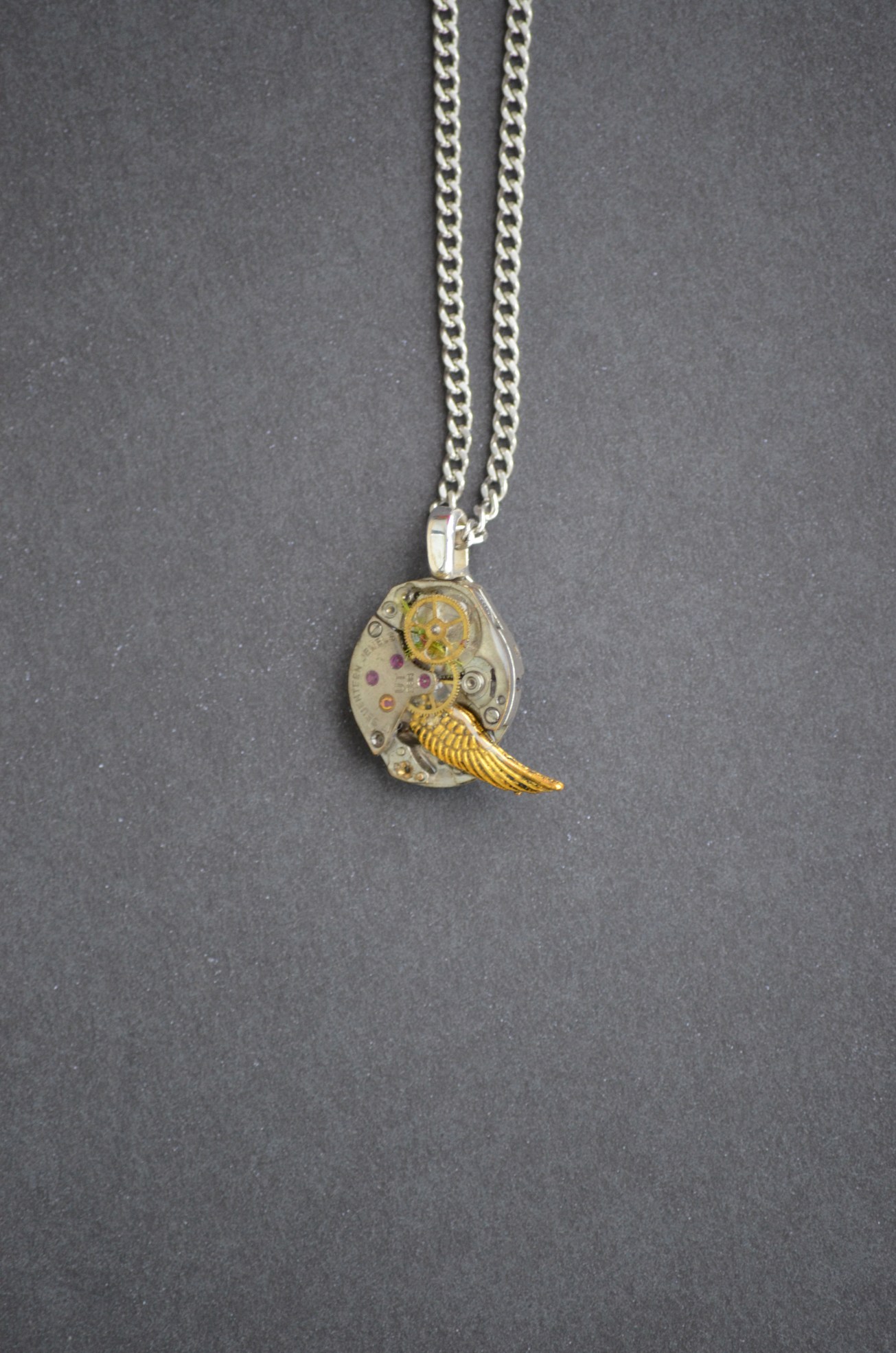 A tiny and angular antique watch movement, has a thin coat of resin and a brass gear at the top. A small gold-colored, metal wing sits at the bottom. This has a silver bail and hangs from a stainless steel chain.