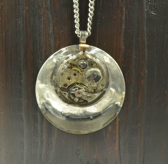 A round antique watch movement is placed on top of a domed metal disc. There is a coat of resin over the top and underside of the pendant. This hangs from a silver plated bail and a stainless steel chain.