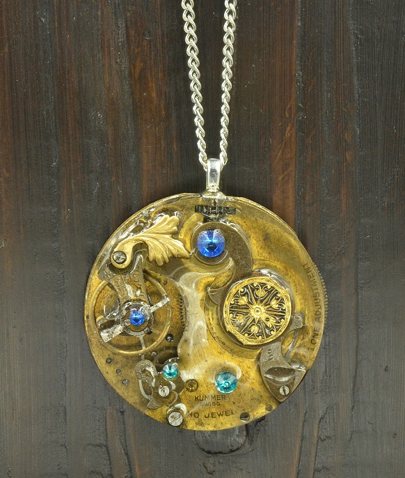 This is an antique watch movement which is marked with the name of Kummer, who was a watch maker in the middle of the 1800’s. So, this movement would be built by him or his company in the 1850’s, most likely. The movement has a gold plated leaf on the upper left side and a gold colored spring cover, from the 17th century, is on the right side. There are four blue Swarovski crystals attached to the top along with a coat of resin.