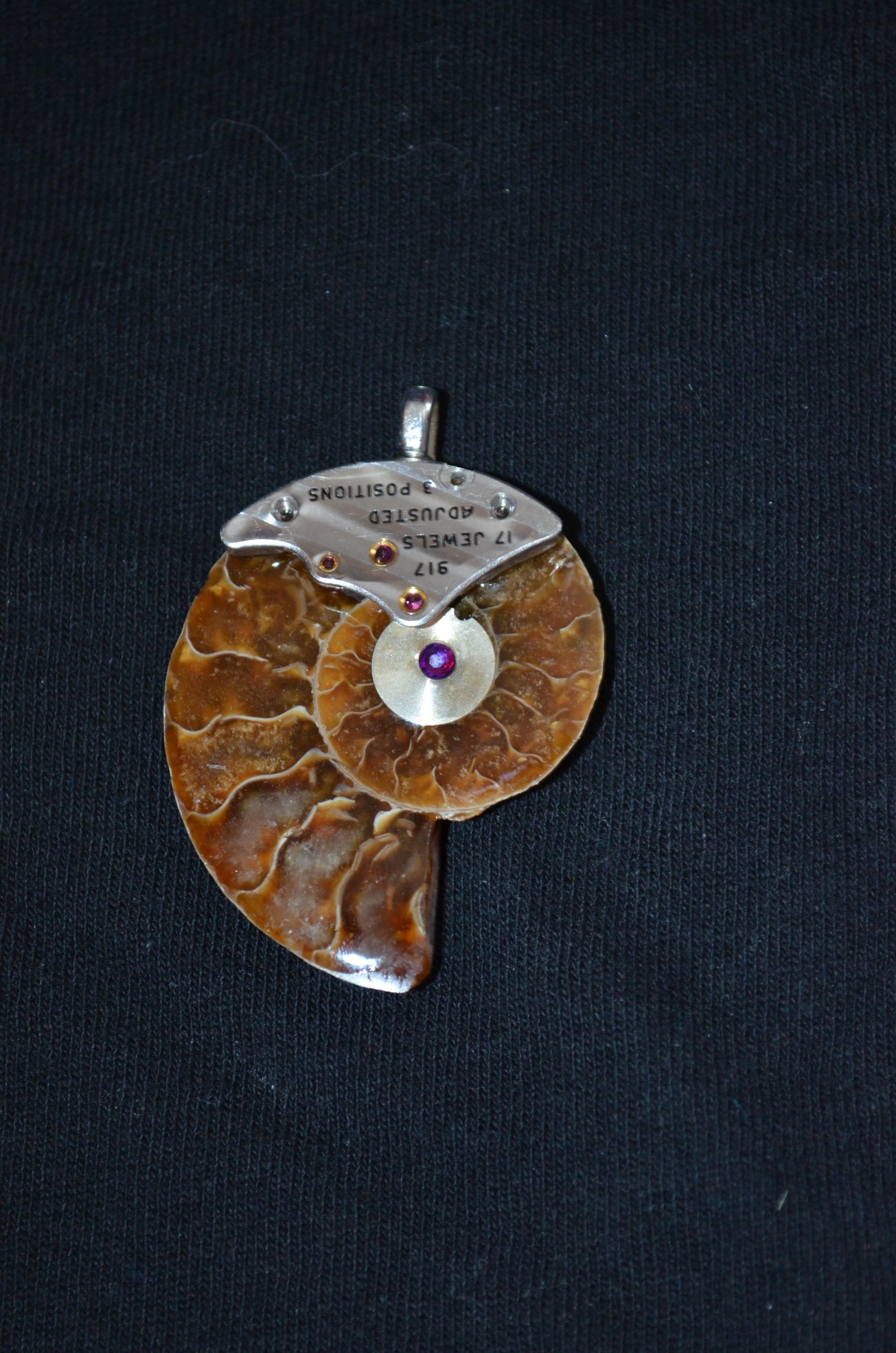An Ammonite fossil, which is alone from 252 to 66 million years old, sits with an antique spring case in the center and a purple Swarovski crystal in the center. The top of this fossil has a movement plate from an antique watch, with 3 of the rubies still intact. This has a silver plated bail.
