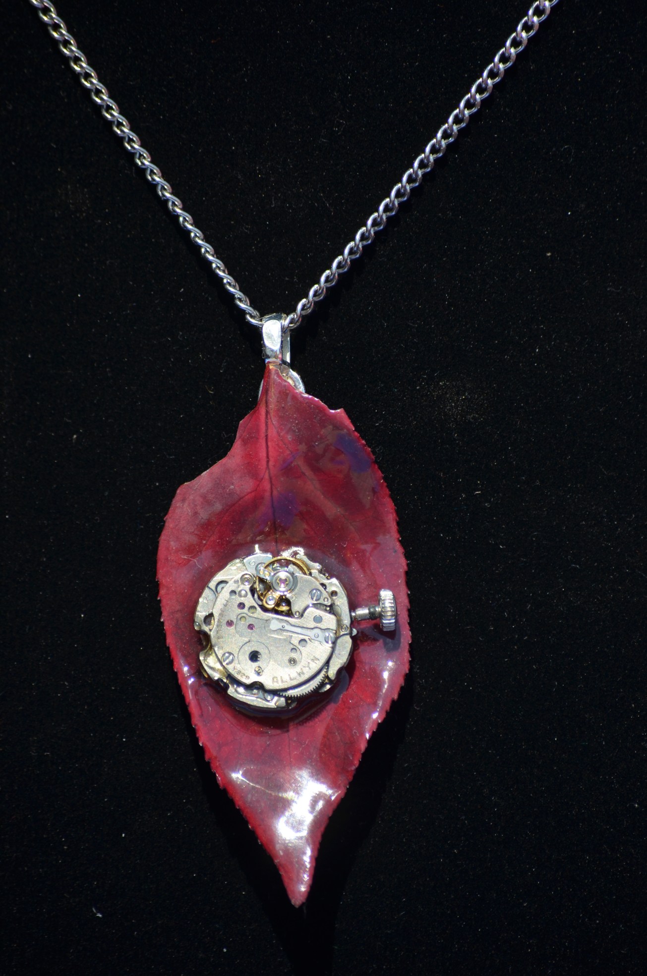 This necklace was made using a leaf from a plant called the Chokeberry ( Aronia arbutifolia Brilliantissima). This bush turns the pear shaped green leaves into a fiery red color at fall. This is one of those leaves, and it was coated in resin to prevent it from decomposing. There is a small antique watch movement, attached in the center of the leaf. This has a silver plated bail on the back and a stainless steel chain. It is a great mixture of industrial and natural elements.