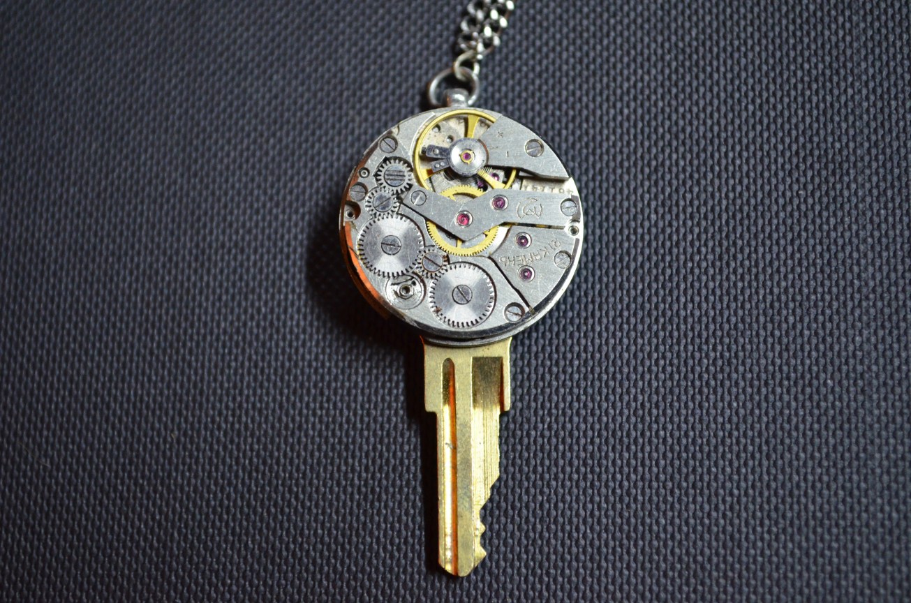 An antique 1930’s watch movement has been attached to the top of an unused key. The shape it makes reminds me of an Art Deco style. This hangs with a silver plated bail and a stainless steel chain.