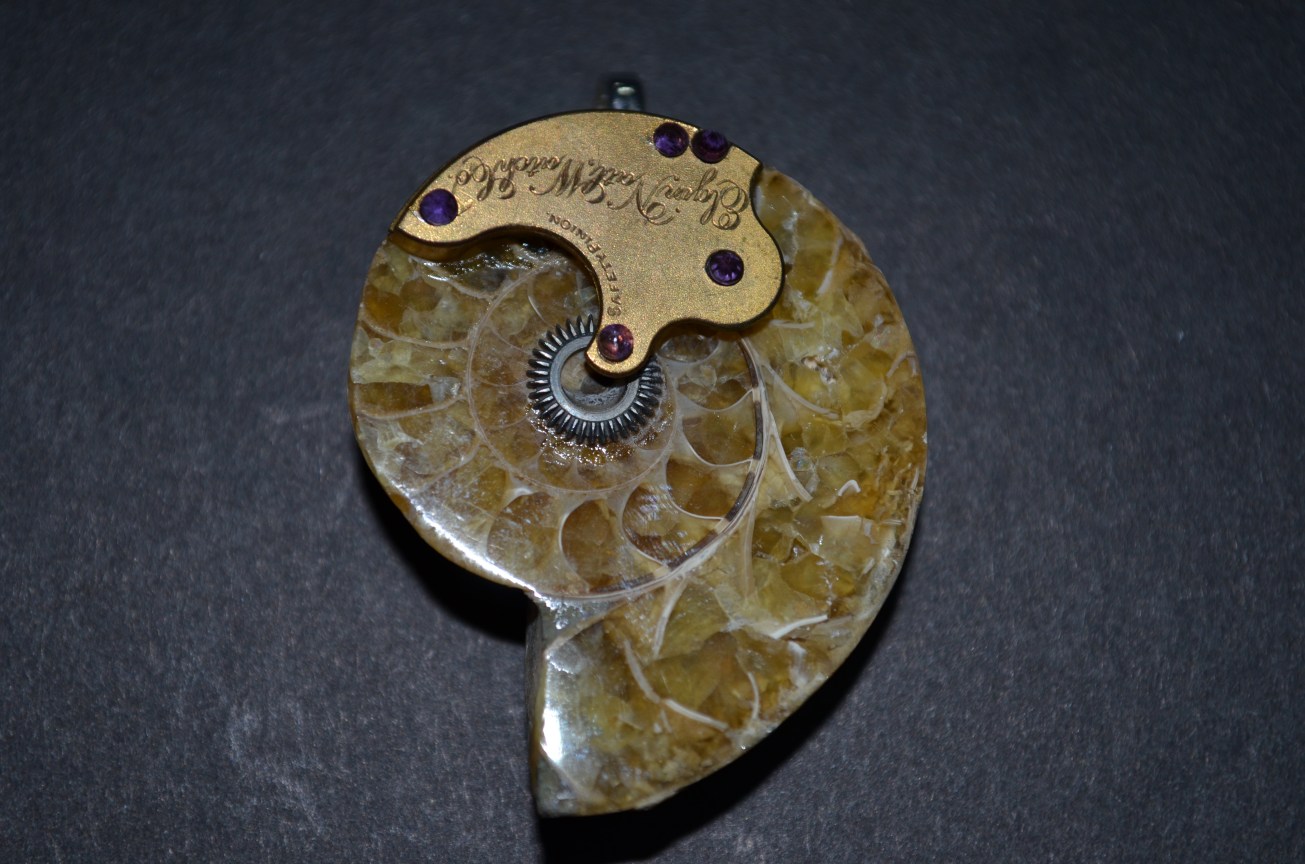 A slice of Ammonite/Ammolite fossil, that is over 100 million years old, is paired with a small gear in the center and a plate from an antique watch movement. The movement belongs to the Elgin National Watch Company and is most likely from the early 1900’s. There are crystals attached to the top of the plate and this has a silver plated bail on the back.