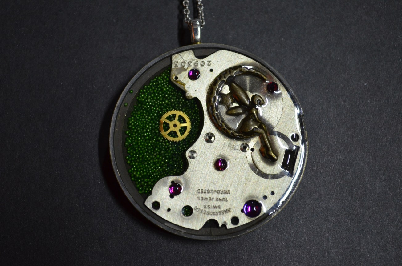 Green metal beads fill the inside of an antique pocket watch case along with a single gold colored gear. A watch plate from an antique movement is attached to the top with five purple Swarovski crystals. There is a layer of resin over this and then a brass Fairy charm is attached to the top. This hangs with a silver plated bail and a stainless steel chain.