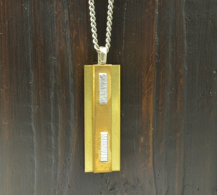 This is one of the third Art Deco inspired pieces done and while it looks simple enough, the minimalist style is hard to accomplish. A 2 inch long, thin metal tag, made of Brass sits at the base as a narrow strip of NuGold (85% copper and 15% zinc), sits in the middle. Smaller Aluminum strips are attached to the NuGold piece and this has a silver plated bail on the back and hangs with a steel beaded chain.