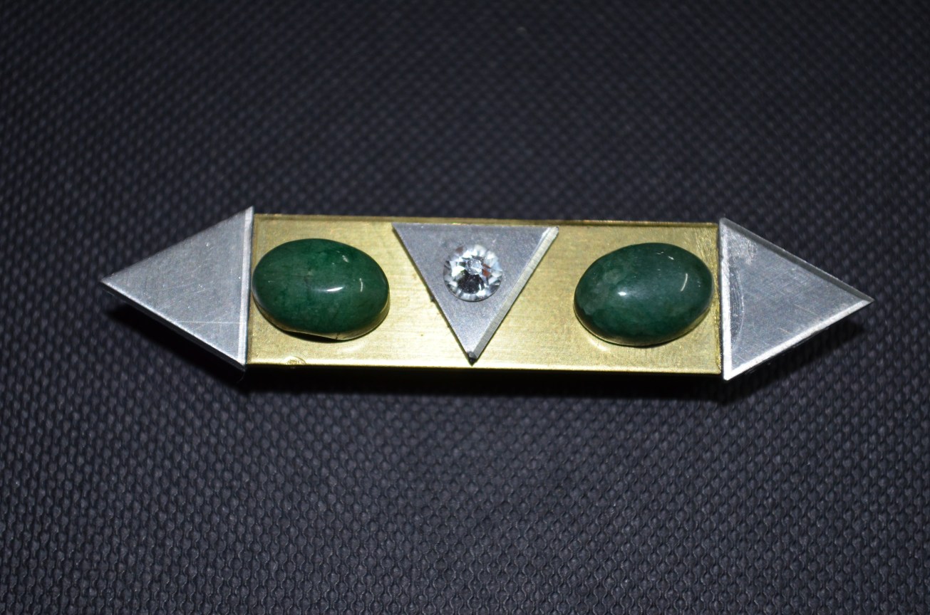 This is a 2 inch long brass tag with an aluminum triangle attached to either side and one on the front, in the middle. There are two slanted emeralds, on the front and a Swarovski crystal in the center triangle. This has a super magnet on the back.