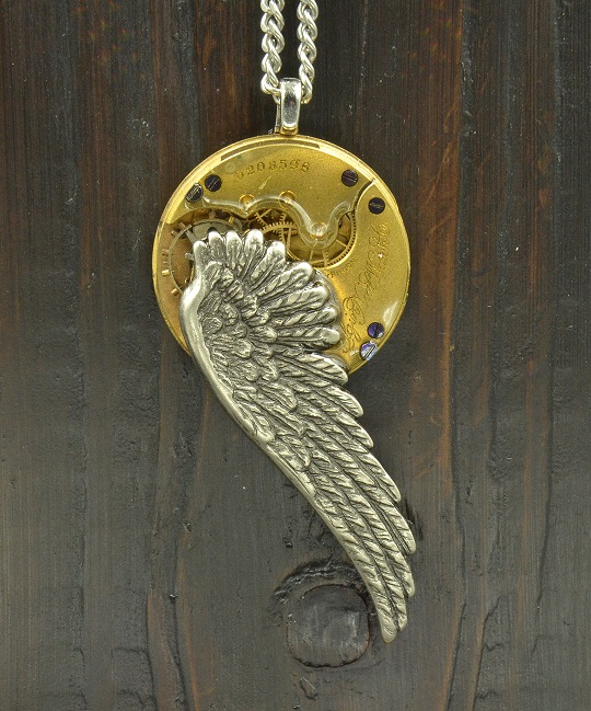 This is a simple looking pendant but it shines with a gold colored metal under a thin coat of resin. There is a metal wing on the side. The watch movement was made by the Elgin National Watch Company and the serial number places it in a production year of 1894. As if it wasn’t rare enough to have an old watch movement, this model was 1 of 2,000 made, at this year.