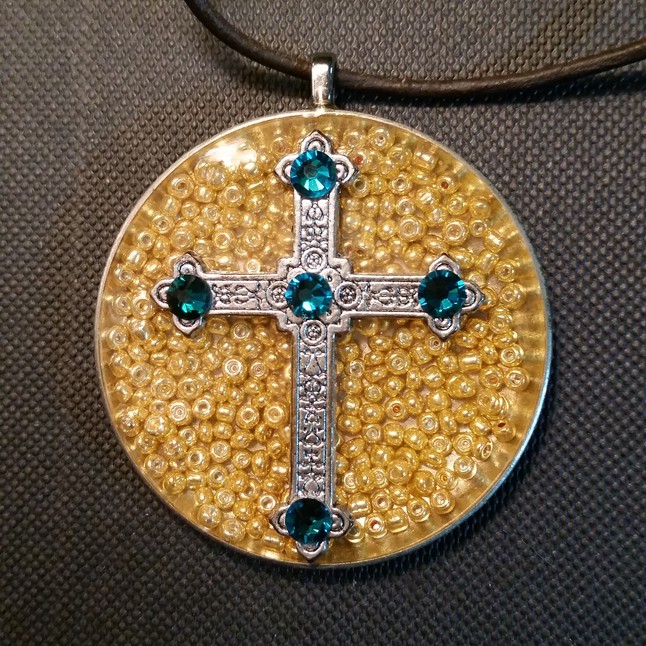 An antique pocket watch case back has been filled with gold-colored metal beads and resin. There is a metal cross attached to the top and 5 Swarovski crystals have been attached to the cross. This has a silver plated bail and a leather chord.
