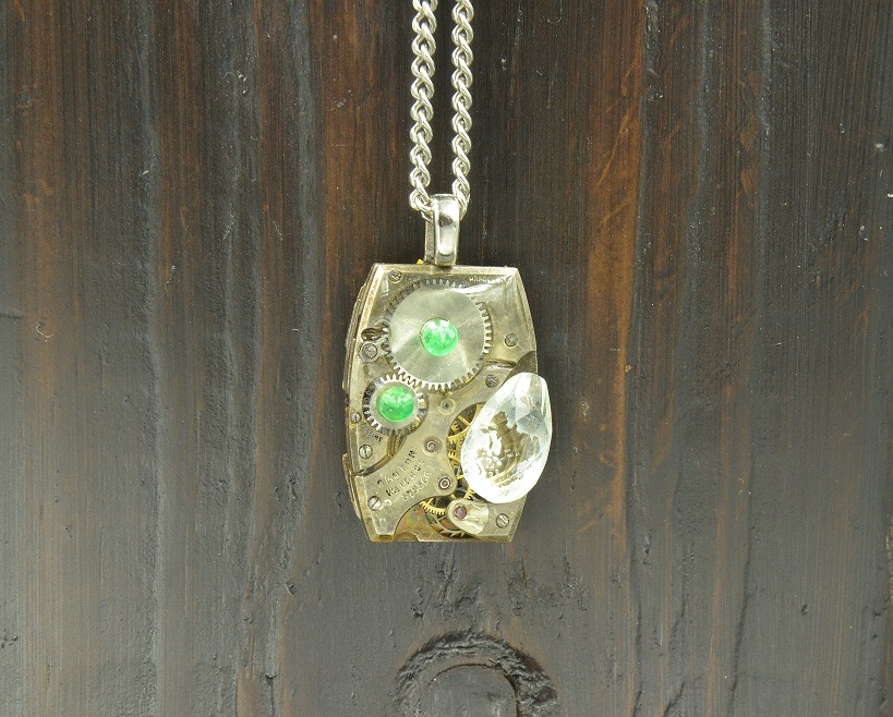 This angular antique watch movement has a coat of resin over it and a two round emeralds were placed on the side. Opposite of those is a large white topaz. This hangs with a stainless steel chain.