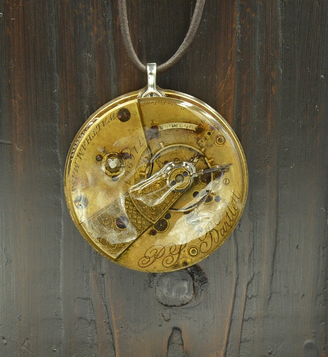 An American Waltham Watch Company movement, from 1873, is simply coated in resin and hangs with a silver plated bail and a leather chord.
