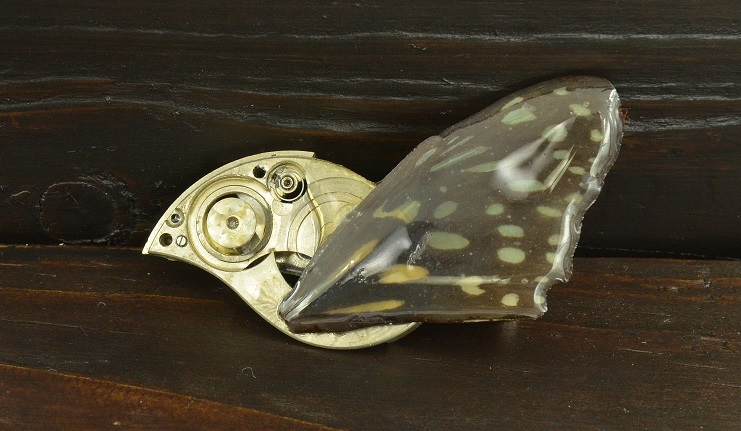 A pin is made with an antique watch movement plate, a large white topaz and a butterfly wing, which was coated in resin. There is a horizontal pin back.