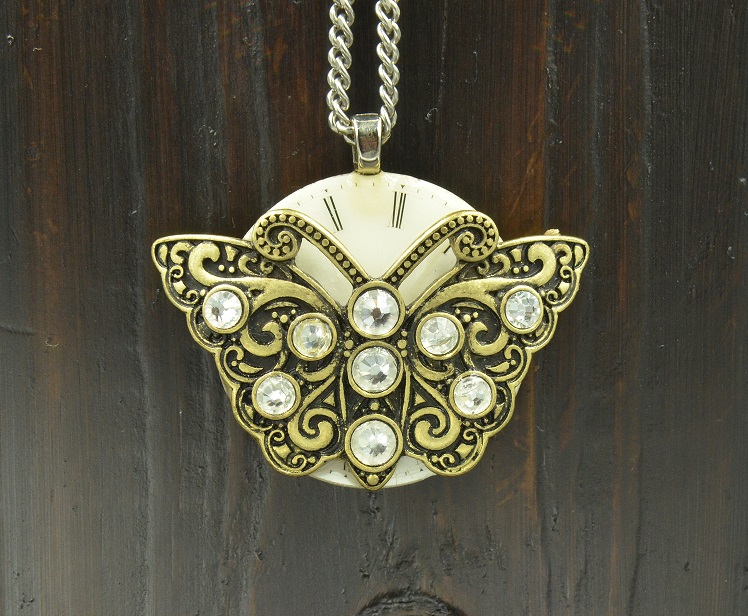 A gold colored, metal butterfly has Swarovski crystals inside it and is attached to the top of an antique watch face. This hangs with a silver plated bail and a stainless steel chain.