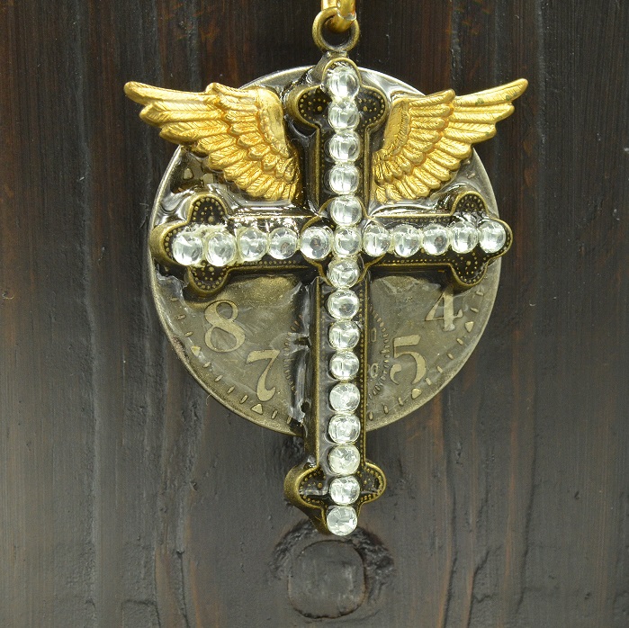 A metal watch face sits with a bronze, metal cross on top. Lining the center of the cross, are Swarovski crystals and resin. There are two gold-colored, metal wings at the top. This hangs with a braided leather chord.