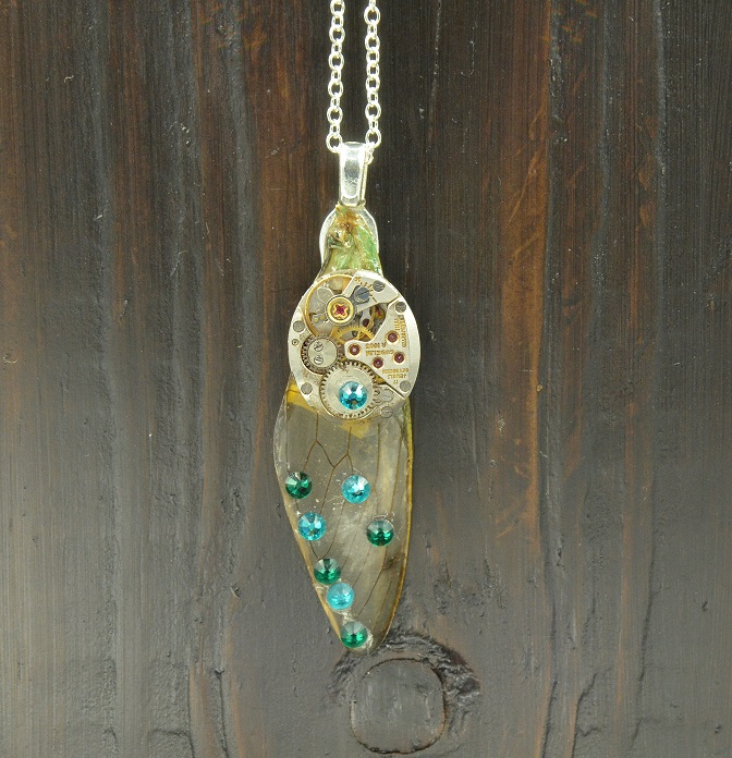 An antique watch movement sits under a thin coat of resin and is attached to a cicada wing. A coat of resin is over the wing and there are eight blue Swarovski crystals on top. This has a silver plated bail on the back.