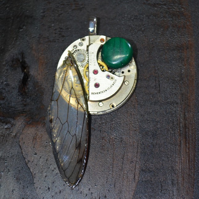 An antique watch movement has a cicada wing attached to one side and a large circle of malachite on the other side. There is a coat of resin over the cicada wing and a silver plated bail on the back.