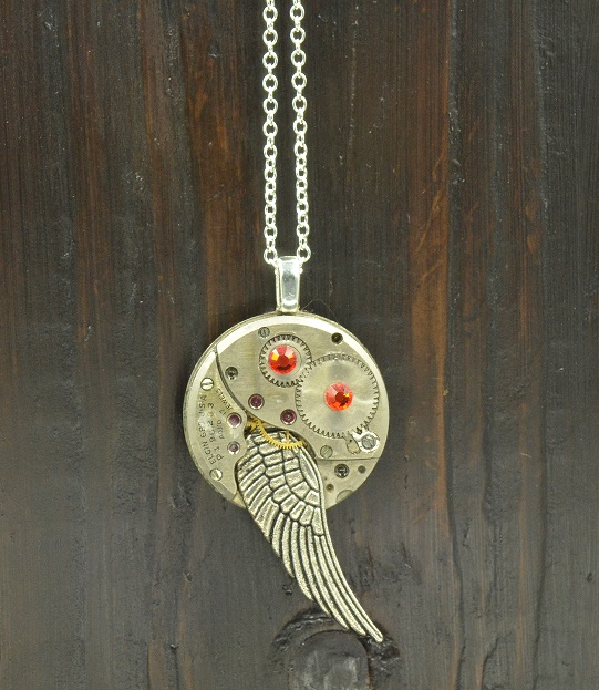 This small watch movement was made by the Elgin National Watch Company in 1952. The movement has a thin coat of resin, a small metal wing on one side and two fire, Swarovski crystals. There is a silver plated bail on the back and hangs with a silver plated chain.