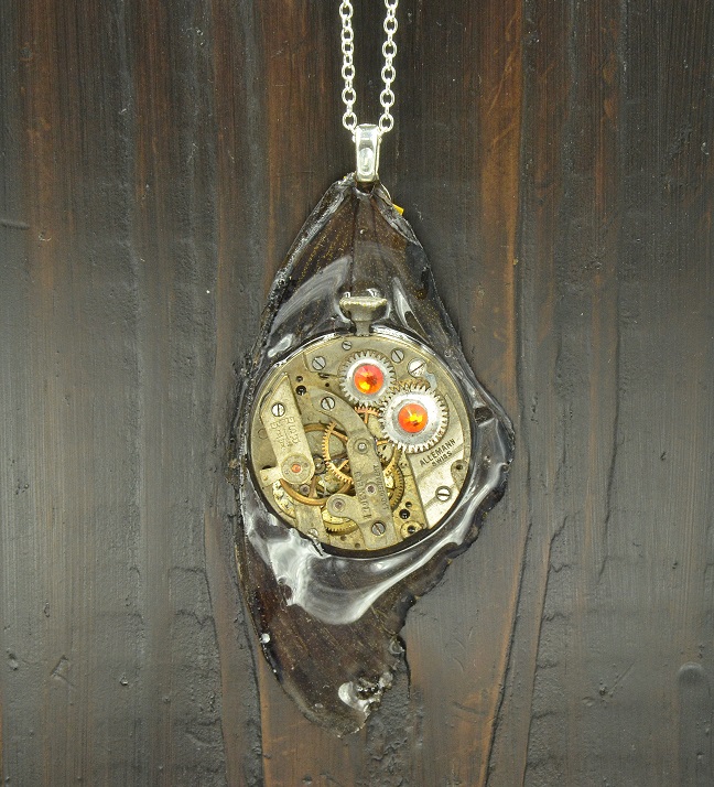 An antique Swiss watch movement, was coated in a thin layer of resin and attached to the top of a large butterfly wing; also coated in resin. There is a silver plated bail on the back.