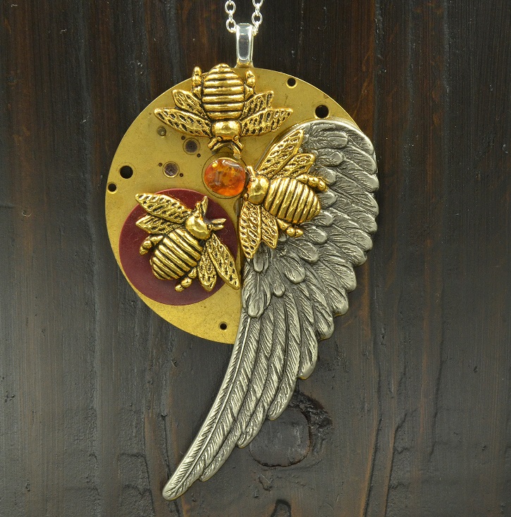 This large pendant, was made from the bottom plate piece from an antique pocket watch movement. It has a large metal wing on one side and a piece of amber in the center. Around the amber are three gold plated bee charms. There is a silver plated bail on the back of this.