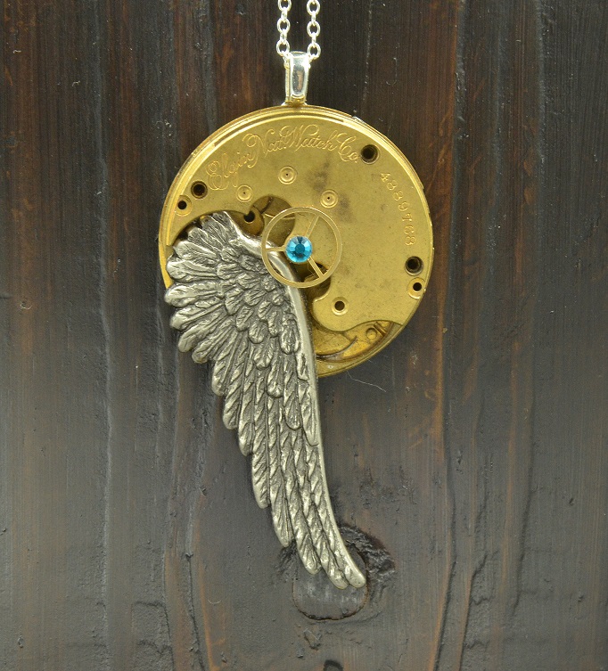 This pendant was made using an antique watch movement, made by the Elgin National Watch Company, in 1893. There is a small watch wheel in the center, with a single blue Swarovski crystal. There is a metal wing attached to the side and this hangs with a silver plated bail.