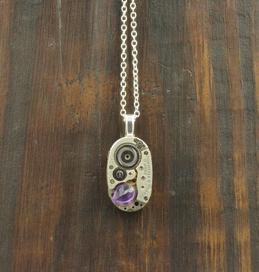 An oval shaped watch movement, made by the Elgin National Watch Company in 1947, sits with a thin coat of resin and a large pear-shaped amethyst on the bottom. This has a silver plated bail on the back and hangs with a silver plated chain.