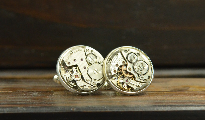 A pair of round,antique watch movements were made by the Hafis Watch company and sit attached inside of a pair of cufflink blanks.