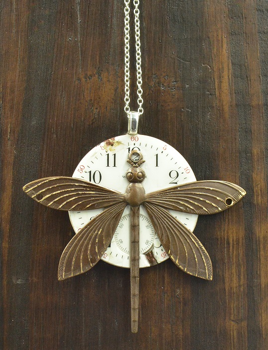 An porcelain coated, copper, antique dial has a coat of resin and has a metal dragonfly attached to the front. This has a silver plated bail on the back and hangs with a silver plated chain.